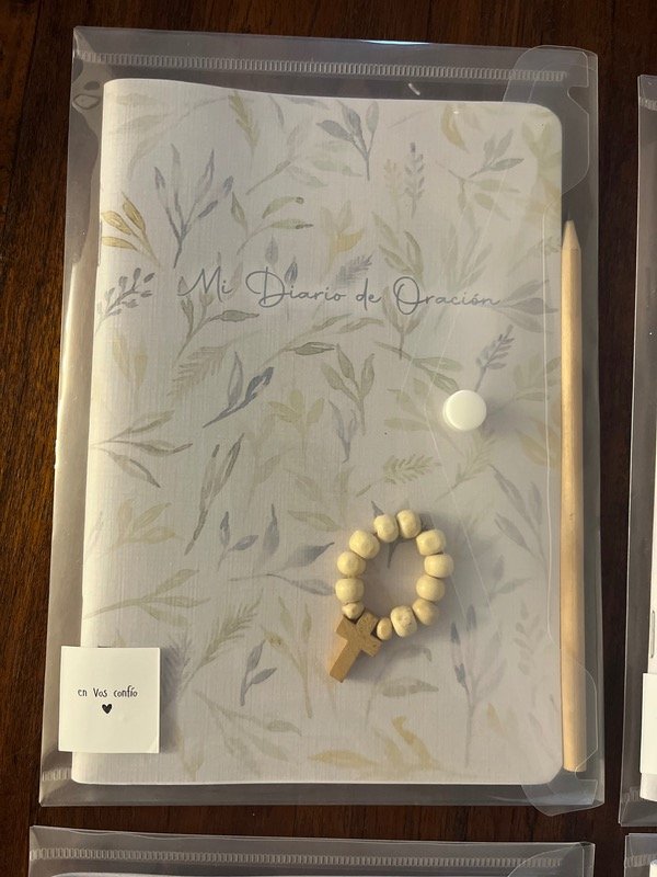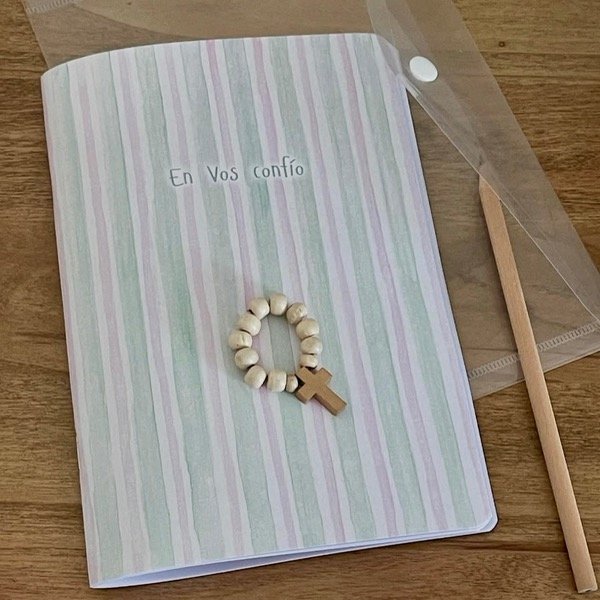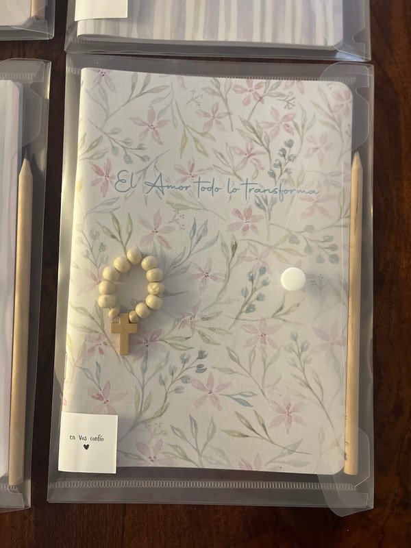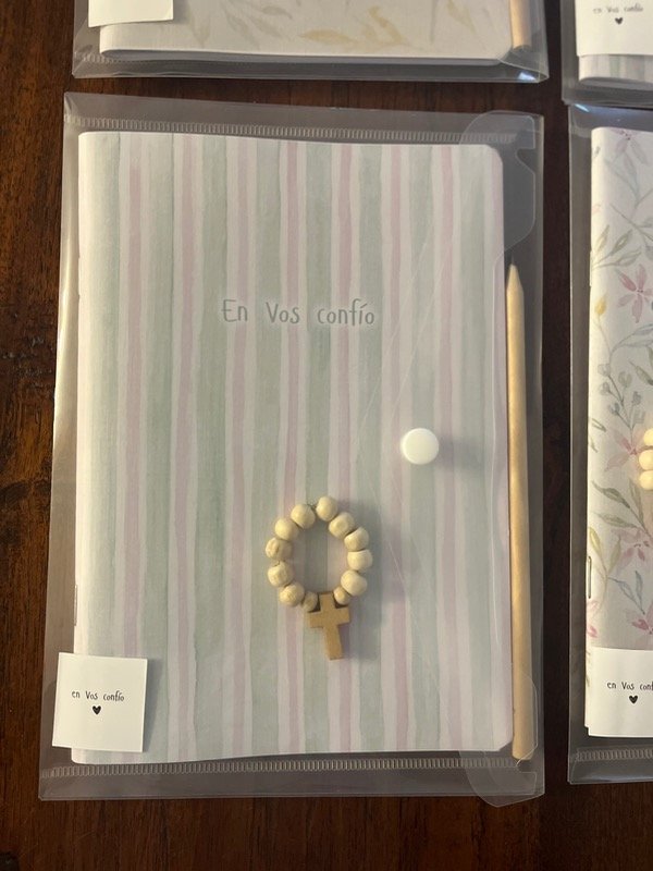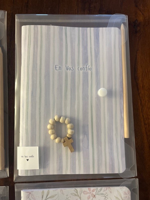Set de cuaderno, lápiz, denario y sobre. Ideal para catequesis, retiro, convivencia, o para esos momentos únicos de oración